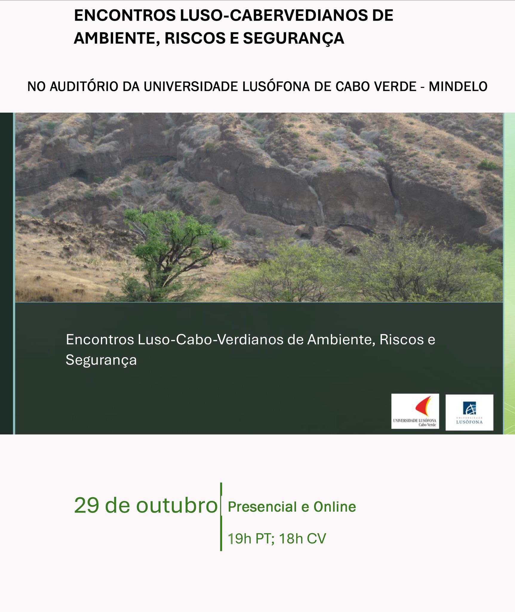 No âmbito da parceria entre a Universidade Lusófona de Cabo Verde e o Instituto Universitário do Porto, a ULCV promove um encontro que visa ser um sítio de reflexão e debate para o engajamento em tratar a temática do Ambiente, Riscos e Proteção Civil.