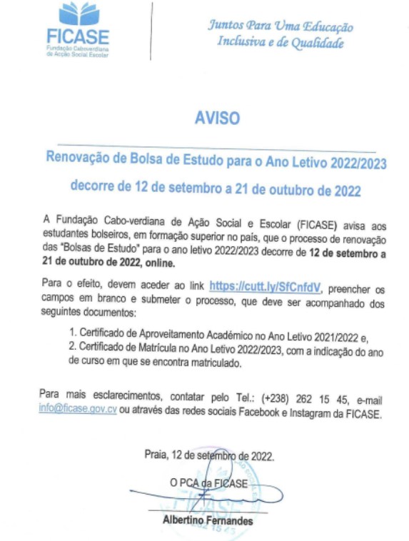 A Fundação Cabo-verdiana de Ação Social e Escola (FICASE) avisa aos estudantes bolseiros, em formação superior no pais, que o processo de renovação das "Bolsas de Estudos" para o ano letivo 2022/2023 decorre de 12 de setembro a 21 de outubro de 2022, online.