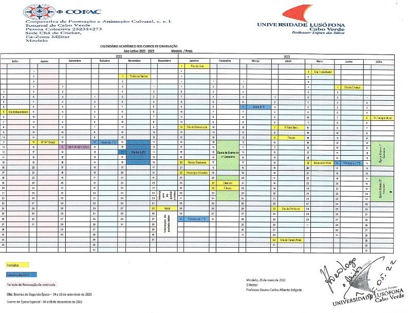 A Universidade Lusófona de Cabo Verde, para os devidos efeitos, apresenta o Calendário Académico para os cursos de Licenciatura, para funcionamento das Unidades Orgânicas do Mindelo e da Praia, no ano letivo 2022 / 2023.