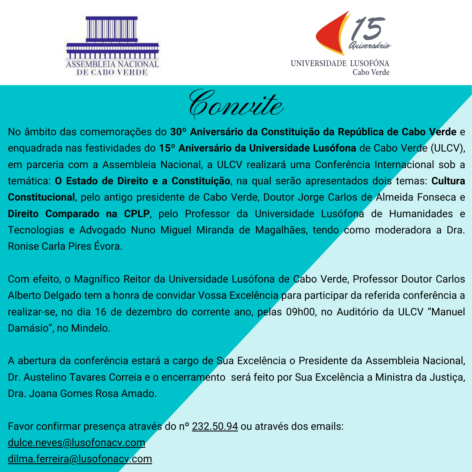 A referida conferência, que terá lugar no Auditório “Manuel Damásio” na Universidade Lusófona de Cabo Verde, enquadra-se nas comemorações do 30º Aniversário da Constituição da República de Cabo Verde e nas do 15º Aniversário desta universidade. Visa trazer ao debate aspectos importantes sobre a temática e constitui um momento para a elucidação dos vários pontos de contato das constituições dos diferentes países da CPLP e a cultura constitucional.