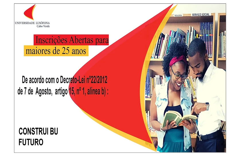 A Universidade Lusófona de Cabo Verde informa a todos os interessados que aceita candidaturas para maiores de 25 anos, com Ensino Secundário Incompleto, nas suas Ofertas Formativas para o ano letivo 2022/2023.