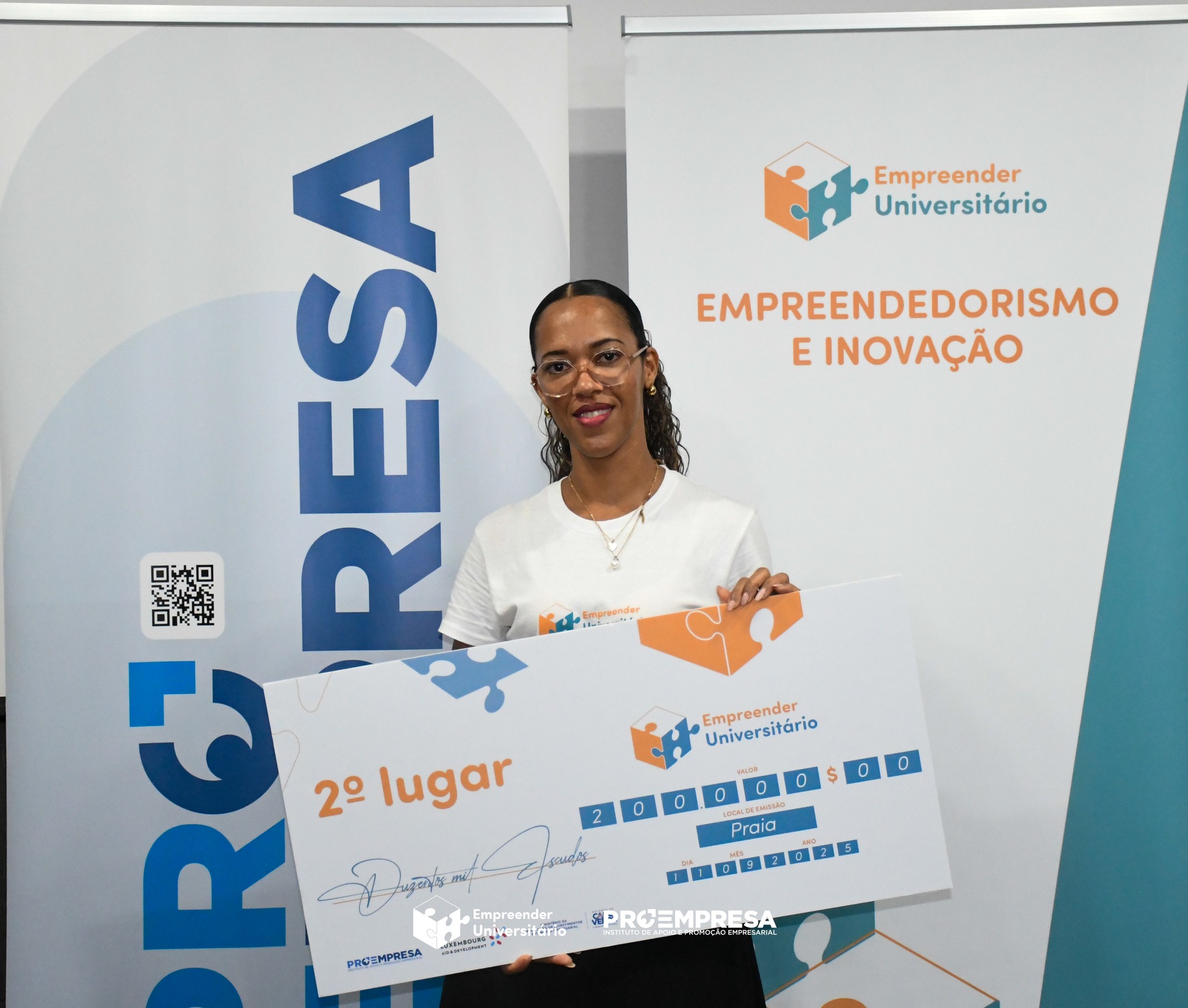 2ª colocada no 𝐂𝐨𝐧𝐜𝐮𝐫𝐬𝐨 𝐄𝐦𝐩𝐫𝐞𝐞𝐧𝐝𝐞𝐫 𝐔𝐧𝐢𝐯𝐞𝐫𝐬𝐢𝐭𝐚́𝐫𝐢𝐨 𝟐𝟎𝟐𝟓 – Sandra Carvalho, recém-formada na Universidade Lusófona de Cabo Verde.